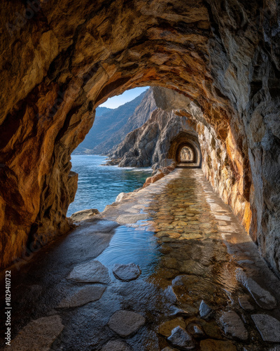 © Petr, Obraz premium Cliffside tunnel with reflective liquid metal wall and natural sea light