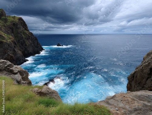 © alya, Fototapeta premium Cliffside view with turquoise churning water under a moody clouded sky