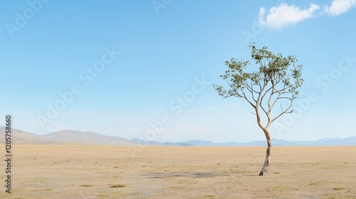 © artchvit, Obraz premium Climate change: Pollution and temperature rise. Lonely tree in a vast, open landscape under a clear blue sky.