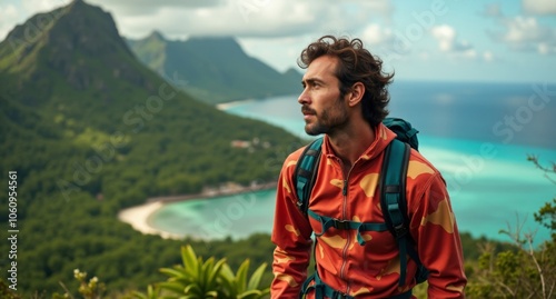 © Collse, Naklejka premium Climber near Bora Bora, French Polynesia, vibrant red and orange tones, nature-inspired camouflage captured in 8k on Hasselblad X1D.
