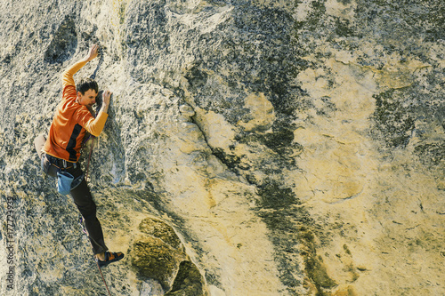 © Vitalii Nesterchuk, Obraz premium Climber to climb to the top of the mountain.