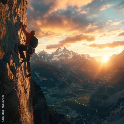 © Murad, Obraz premium Climbing a challenging rock face against the backdrop of the majestic snow-capped mountains during a brilliant sunrise.
