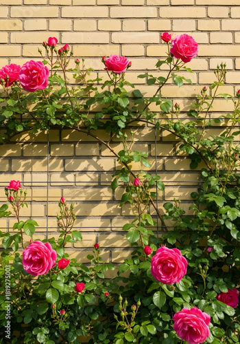 Naklejka premium Climbing roses with vibrant pink blooms adorning a textured brick wall. These...