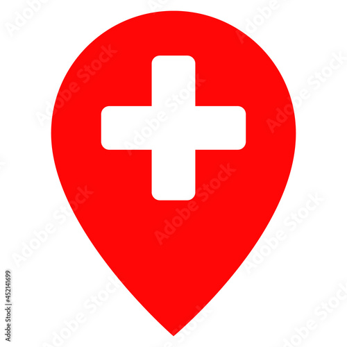 © Sergey, Fototapeta premium Clinic map pointer icon with flat style. Isolated vector clinic map pointer icon image on a white background.