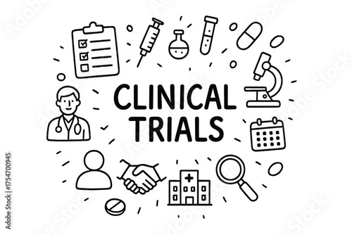© GRACE, Naklejka premium Clinical Trials Doodle. Clinical Trials. Hand-drawn doodle illustration of Clinical Trials. clipboard,