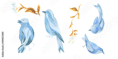 Fototapeta premium Clip art blue birds with leaves and flowers drawn with acrylic on white...