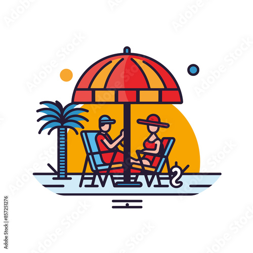 Obraz premium clipart vector illustration of a young couple or friends sitting on deck xchairs with palm tree, parasol, umbrella, sea, sunny