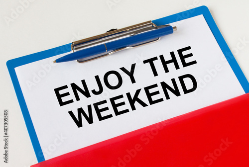 Obraz premium Clipboard with text Enjoy The Weekend blue pen and red folder