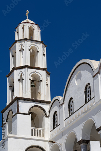 © FineBokeh, Fototapeta premium Clocher de l'église Theotokaki à Pyrgos sur l'île de Santorin