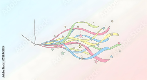 © Erik, Fototapeta premium Clock Hands with Colorful Ribbons and Stars Abstract Illustration