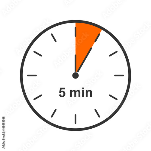 © vikusha_art, Obraz premium Clock icon with 5 minute time interval. Countdown timer or stopwatch symbol isolated on white background. Infographic element for cooking or sport game. Vector flat illustration.