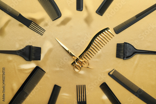 © New Africa, Fototapeta premium Clock made with hairdresser's tools on golden fabric, flat lay