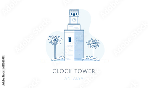 © Anastasiia, Obraz premium Clock tower, Antalya, Turkey. The famous landmark of Antalya, tourists attraction place, skyline vector illustration, line graphics for web pages, mobile apps and polygraphy.