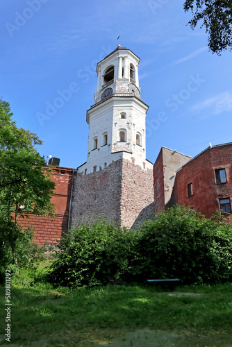 © mivod, Fototapeta premium Clock tower in Vyborg, Russia. Cityscape with old stone houses in the historic center.