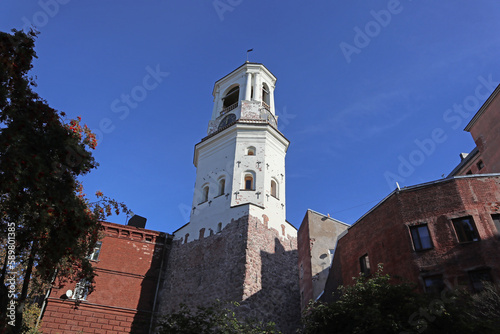 © mivod, Fototapeta premium Clock tower in Vyborg, Russia. Cityscape with old stone houses in the historic center.