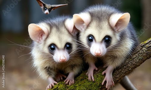 © Tj, Fototapeta premium Close Encounter Adorable Possums Two Young Ones on Branch With Bat Flying Over Cute Mammals