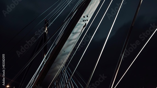 © Thanthara, Obraz premium Close focus on a bridge with architectural lighting, steel cables highlighted against the night sky.