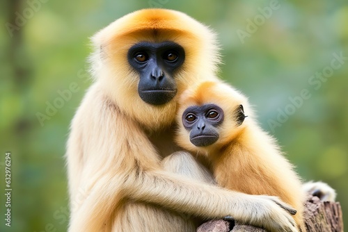 © MstAsma, Fototapeta premium Close image of Cheeked Gibbon monkey mother with a child in the forest.
