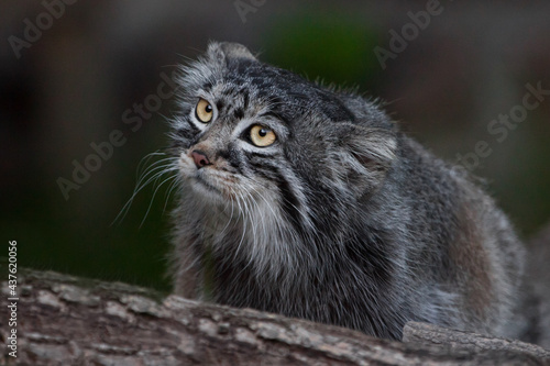 © Mikhail Semenov, Fototapeta premium close look of Pallas's cat sitting on a tree, wild cat. Close-up.