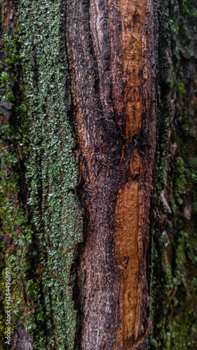 Fototapeta premium Close macro view of rough trunk texture with green moss