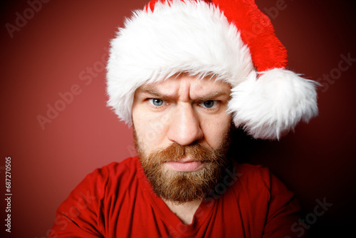 Naklejka premium Close Portrait of bearded Santa Claus in red hat, white beard with pensive...