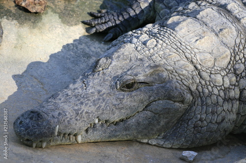 Fototapeta premium Close portrait of Nile crocodile, Crocodylus niloticus, mouth and teeth.