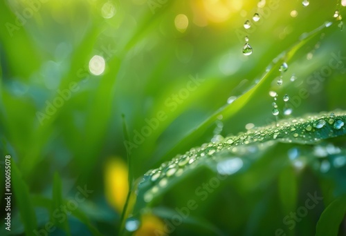 Fototapeta premium close raindrops glimmering lush green leaves vibrant natural background,...