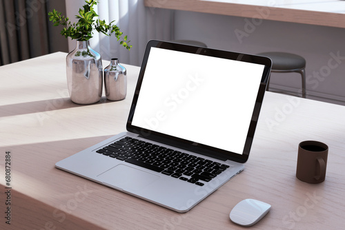 © Who is Danny, Fototapeta premium Close u of creative designer desktop with empty white mock up laptop computer screen, coffee cup, other items. 3D Rendering.
