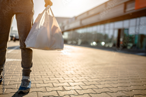 © Vlad, Obraz premium Close-up, a plastic bag filled with groceries, food vegetables and fruits, dairy products. A man stands in parking near a shopping center or a shopping mall. He bought everything at the supermarket