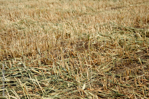 Fototapeta premium Close-up a uncultivated agricultural field with dry wheat stalks.