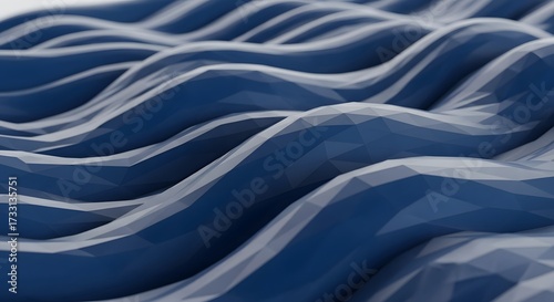 © Agus Through Lens, Naklejka premium Close-up, abstract three-dimensional rendering of smooth, undulating blue waves in a low-poly polygonal mesh pattern, suitable for background and design