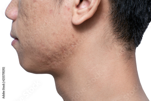 © spyarm, Obraz premium Close-up acne and scars on asian man face, isolated white background