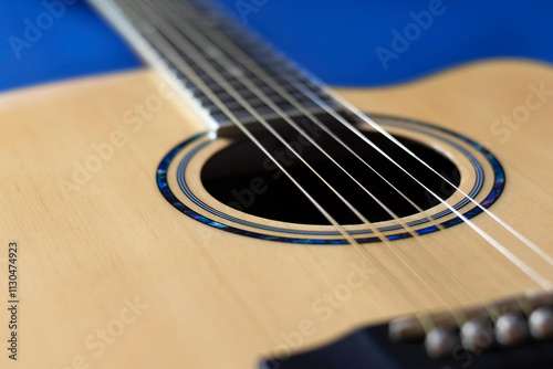 Fototapeta premium Close-up acoustic guitar on blue background. Selective focus