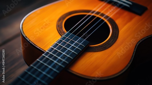 Fototapeta premium Close-up acoustic guitar on wooden surface