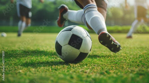 Fototapeta premium Close-up action shot capturing a soccer player's foot striking a soccer ball during a game on a grassy field
