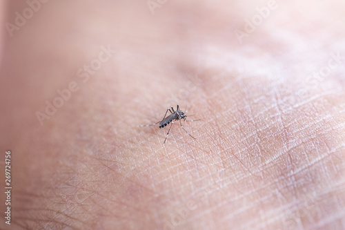 Obraz premium Close-up Aedes aegypti, common house mosquito on human skin, Aedes aegypti sucking blood human.