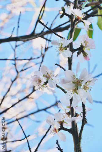 © Karen Images, Obraz premium Close up almond tree branch with leaves blossoming in blue sky.