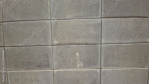 © Leiter1940s, Obraz premium Close-up, and slightly angled view of a simple, unpainted grey concrete block wall or textured pavement, displaying a pattern of rectangular blocks separated by thin grout lines.