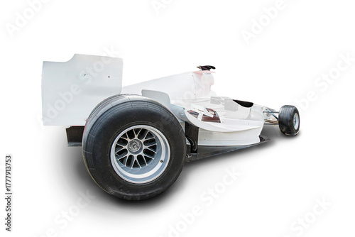 © Mister, Naklejka premium Close-up angle view of a single-seater white Formula 1 car with black rims and tires, under soft diffuse lighting against a neutral background The composition emphasizes the aerodynamic design