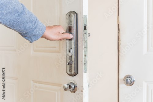 © trongnguyen, Obraz premium Close-up Asian man wears winter clothes opening the door knob