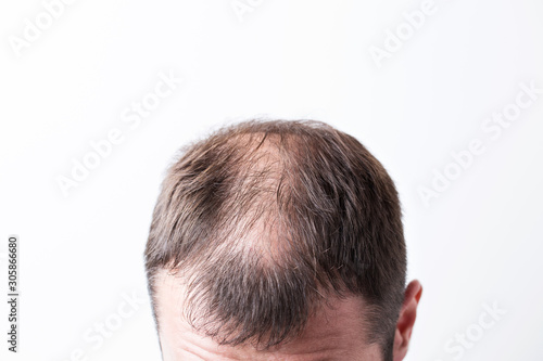Obraz premium Close-up balding head of a young man on a white isolated background.