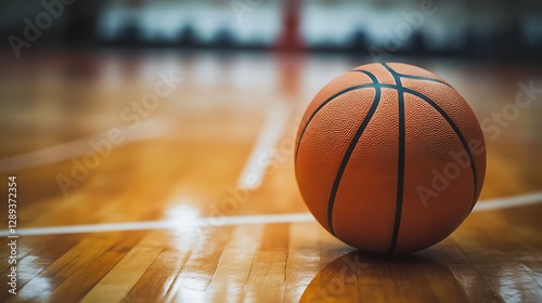 © loxia stock image, Obraz premium Close-up basketball rests on hardwood court, with blurred backdrop of hoop, inside indoor arena