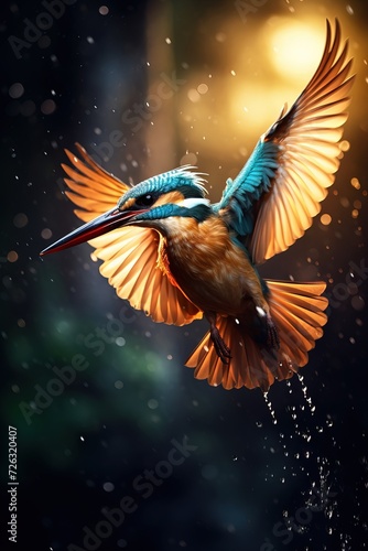 © Tony, Fototapeta premium Close-up Beautiful kingfisher nose-dive, cinematic lighting Generative AI
