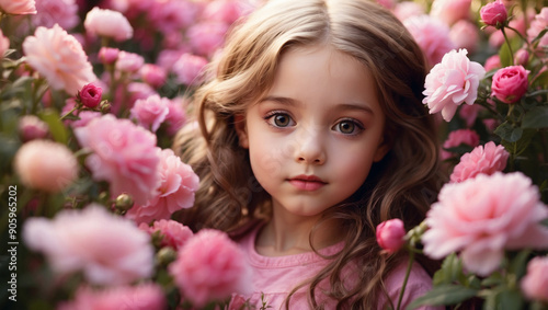 Fototapeta premium Close up beautiful little girl model in the middle of a pink flower garden