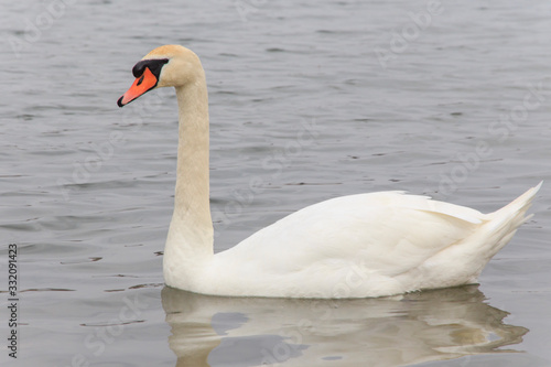© Andrei, Obraz premium Close-up beautiful white swan swims on the lake