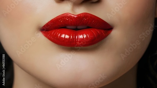 Fototapeta premium Close-up beautiful young attractive woman with super bright red hot lipstick,...