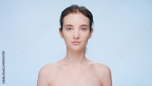 © pavel_dp, Obraz premium Close-up beauty portrait of young brunette woman standing in front of the camera looks at the camera and smiles against a blue background | Skin care product commercial concept