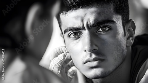 © Kantarika, Fototapeta premium Close-up black and white portrait of a young man with a serious, focused expression, engaged in a deep conversation or reflection.