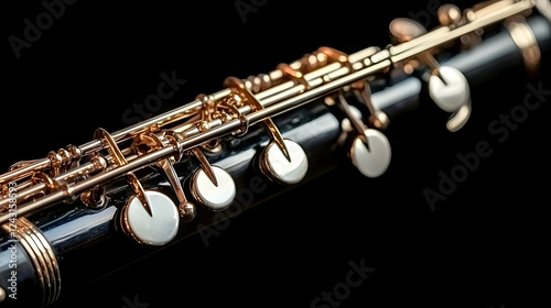 © Pic, Fototapeta premium Close-up black clarinet detail, gold keys, dark background, musical instrument, studio shot
