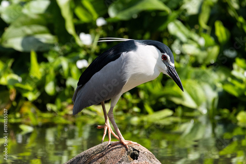 Naklejka premium Close up Black-crowned night heron wading on the water (Nycticorax...